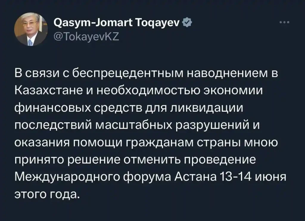 «В связи с беспрецедентным наводнением в Казахстане и необходимостью экономии финансовых средств для ликвидации последствий масштабных разрушений и оказания помощи гражданам страны мною принято решение отменить проведение Международного форума Астана 13–14 июня этого года»,